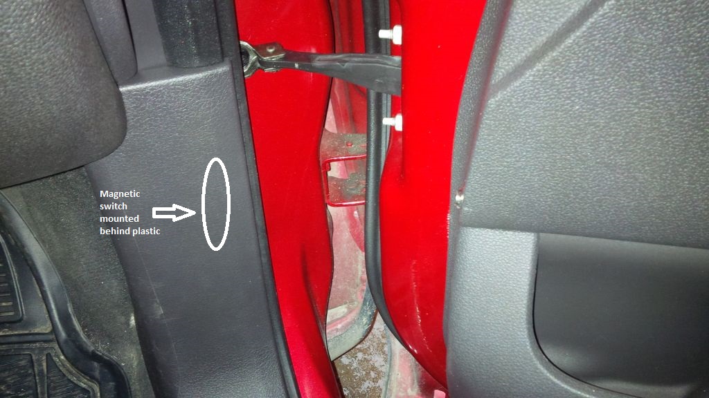 Here are a few pictures of the above project. The magnet is siliconed to the door panel. I've circled the area where the magnetic switch is mounted in behind the plastic trim panel. You can locate the white wire easily behind the panel and trace it along to where you can splice into it. There is also a nearby grounding point for the other side of the switch. -