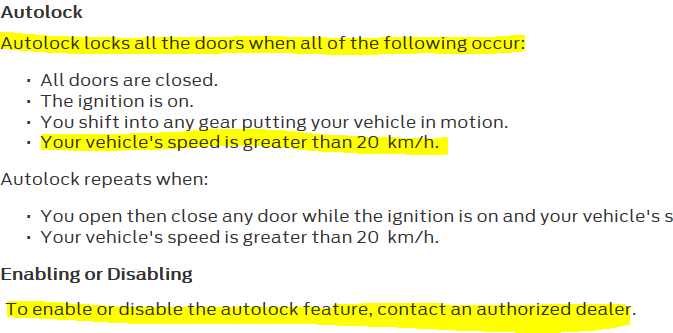4. Perhaps we are talking about two different Autolocks. I am referring to the locking that happens when you drive off and reach 12mph. According to the manual this cannot be disabled via any interface. Must be reprogrammed.