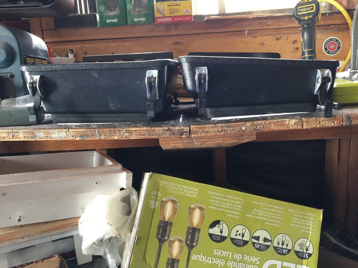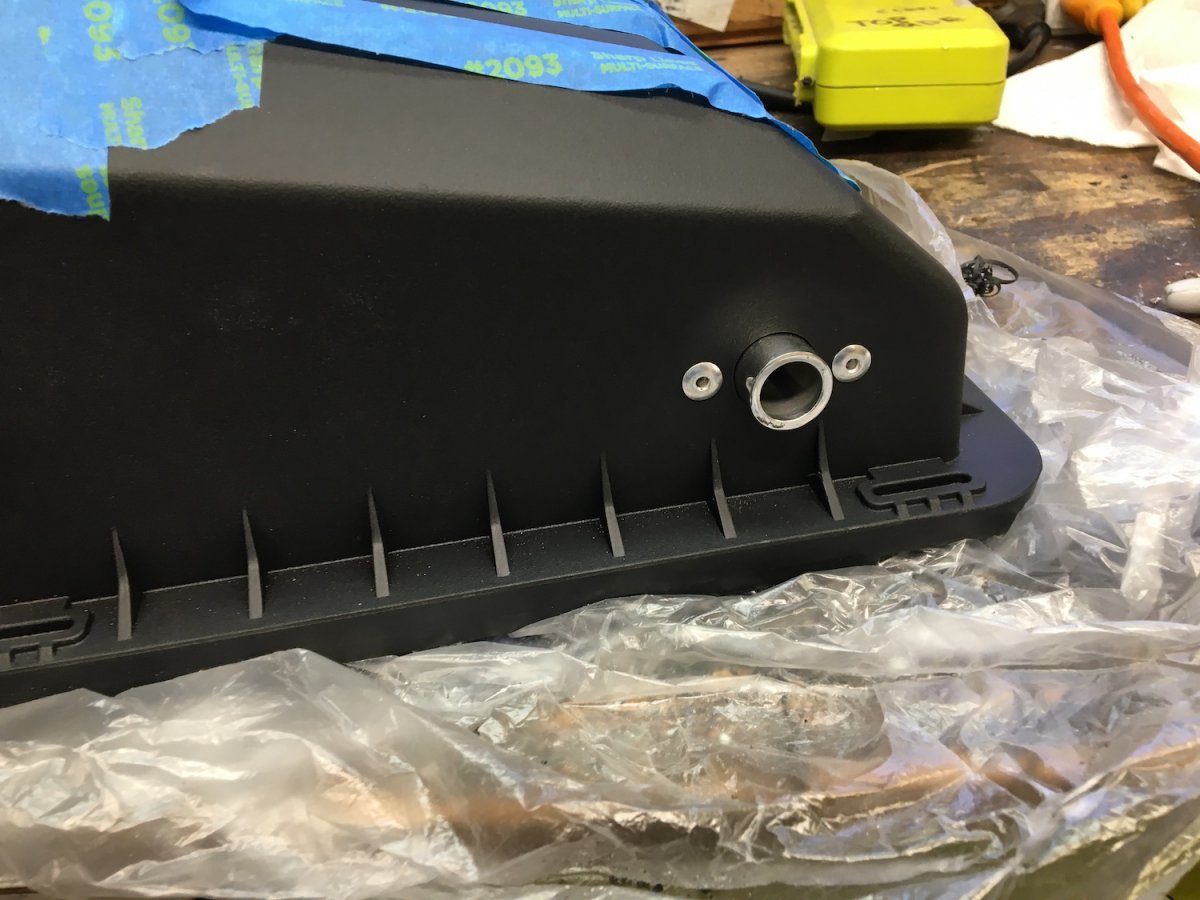 12. Got up early today to avoid the heat. I worked on a lid for the Aux Air today and installed the Sensor port. I am still waiting the Aluminum tube for the Flex hose, but at least the lid is ready when it arrives. This is the jig for drilling the Aux Air hole. The lid bolts to it. Once the lid is bolted to the jig, it is mounted into the drill press. The jig holds the lid at the correct angel for the cut. A special bit is used to achieve a clean cut. I only get one chance so it is measure three times, double check twice, cross my fingers and drill. the hole. A nice clean hole drilled into an uneven surface ready for the aluminum tube that the Flax hose attaches to,