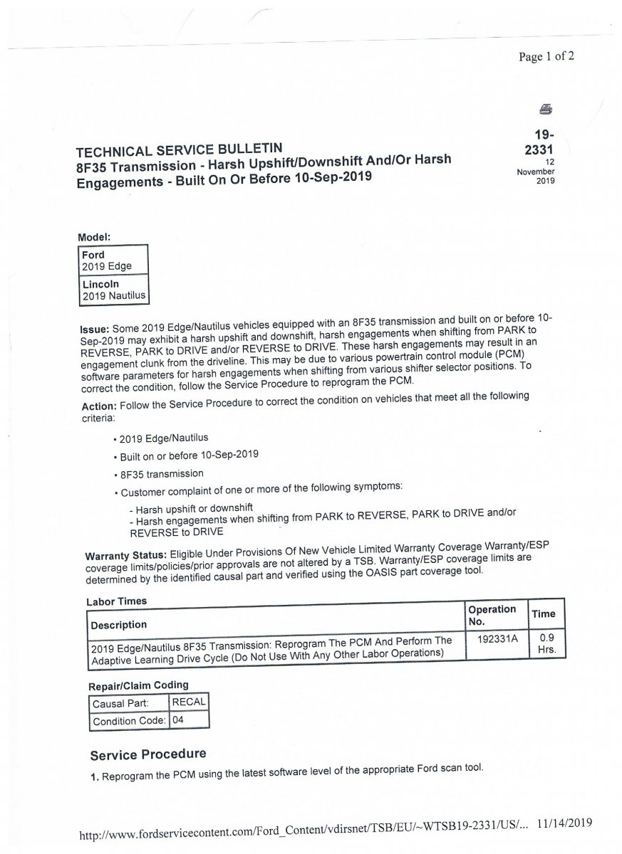 Kcbbriggs: I'm sorry to hear that you have joined the growing group of people that purchased this vehicle and are having problems. This only involves the 8F35 transmissions which are in all of the 2019 Edge Titaniums. I have researched this a good bit and have found that a lot, but not all, of these models, do this. It sounds like you have done just about all that we can do at this point if you opened a case. You can also call ford engineering at 313-518-7309. I also wrote letters and sent them to Dearborn Mi. and finally did receive an answer. Hopefully, with more people bring it to their attention that they will come up with a solution to fix it.