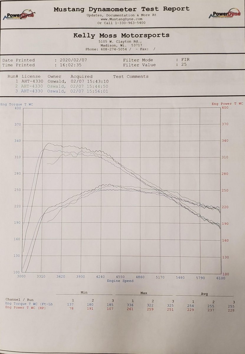 4. Hey all! I got my ST on a dyno for some baselines and all I have to say is...WOW! 261 hp and 336 tq at the wheel on the first pull! Car is in stock form save for a JLT catch can. All pulls were done on 93 octane. Already have the Unleashed tune in (Thanks Torrie!) and waiting for some more dyno time for the results!