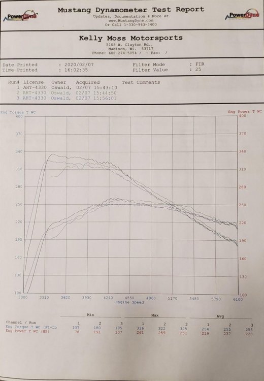 3. My apologies for the late post. It's been a crazy few months. I was able to get back on the dyno when KMR opened their doors again towards the end of May. Results are as follows: Peak HP was up 19, but peak TQ was down 5. The averages for both were up at +22 HP and +24 TQ. The IAT numbers were very high during the run and the KR was peaking around 5. I'm still working with Torrie on this and have a new version of the tune. I have not had the time to get back on the dyno since. I'm honestly OK with the results considering the only mods done for these runs are a K&N drop in and a JLT catch can. I've since put in a 170° Thermostat and colder plugs in an attempt to lower the engine temps and lower the KR. I'm looking to lower the intake temps even more and am considering a FMIC with pipes with new version tune for the next mod. ***EDIT*** After reviewing the post, it looks like some of the number comparisons are wonky. Peak HP was 261 and TQ was 336 with stock tune, and 278 HP and 317 TQ with the Unleashed tune. KMR Dyno Pulls, 2-7-20 vs 5-29-20.pdf