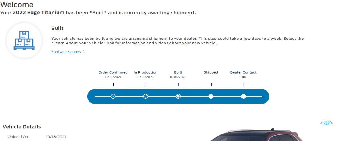 Did your Edge get delivered? Mine hasn't even been picked up yet (but my VIN did show up on the tracking site for the shipping company, so hopefully it's on their radar to pick up!) My status actually went backwards. My status had updated to "shipped" for a day or two, but then went back to status of "built" and awaiting shipping. ? Hoping things just got backed up due to the holiday and it'll be on it's way next week!