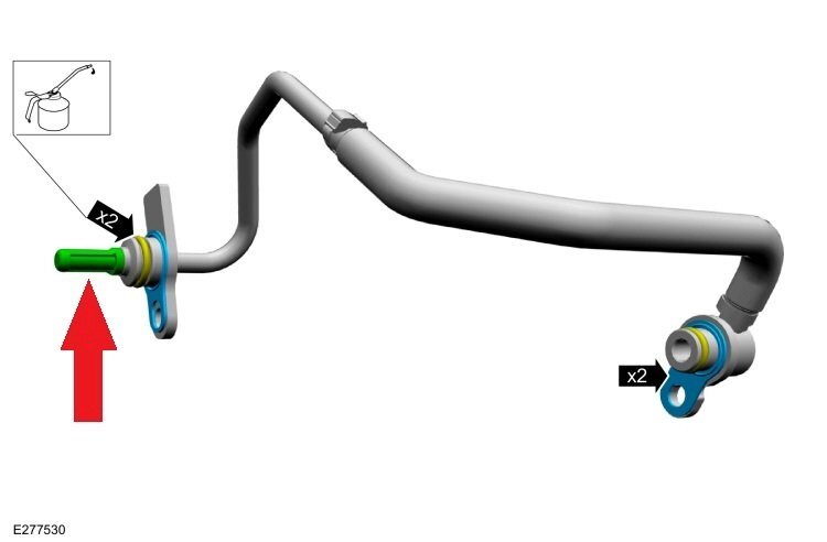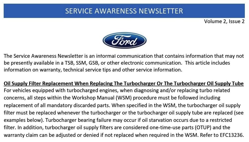Haz Posted March 22, 2024 Author Report Share Posted March 22, 2024 Great question! Essentially, this is Ford's reminder to Service technicians to install new filter/O-rings whenever the tube is removed and reinstalled, or when a new tube is installed if the original tube is damaged. Notable for me was the mention: "the warranty claim can be adjusted or denied if not replaced when required in the WSM " (Workshop Manual). Procedure from the Edge Workshop Manual (with emphasis added)... Upon removal NOTICE: Do not use a metal brush, damage to sealing area will result in leaks. Inspect the turbocharger tube and the sealing surfaces. Ensure that the retaining bracket is not bent, check for square-ness of the retaining bracket to the O-ring area. Use brake cleaner and a nylon brush to clean. Install new components as needed. Material: Motorcraft® Metal Brake Parts Cleaner / PM-4-A, PM-4-B Remove and discard the turbocharger oil supply tube O-ring seals and the turbocharger oil supply tube oil filter. Upon installation Install the new turbocharger oil supply tube O-ring seals and the new turbocharger oil supply tube oil filter. Lubricate the new O-ring seals with clean engine oil. Refer to: Specifications (303-01B Engine - 2.7L EcoBoost (238kW/324PS), Specifications). NOTICE: Do not use a metal brush, damage to sealing area will result in leaks. NOTICE: When installing the turbocharger oil supply tube into the engine block, use care not to damage the new turbocharger oil supply tube oil filter. Carefully use a nylon brush to remove the old O-ring residue and use brake cleaner to rinse the O-ring residue out of the turbocharger tube to turbocharger O-ring bore and the turbocharger tube to engine O-ring bore. Inspect the area for deep scratches and gouges. Install new components as needed. Install the turbocharger oil supply tube, then install and tighten the turbocharger oil supply tube bolts. Material: Motorcraft® Metal Brake Parts Cleaner / PM-4-A, PM-4-B Torque: 89 lb.in (10 Nm) Good luck! 2 Quote Link to comment Share on other sites More sharing options...