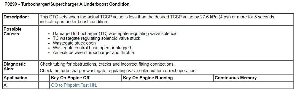 The following description of Diagnostic Trouble Code (DTC) P0299 is from Ford's 2012 Gasoline Powertrain Control/Emissions Diagnosis (PC/ED) Manual...