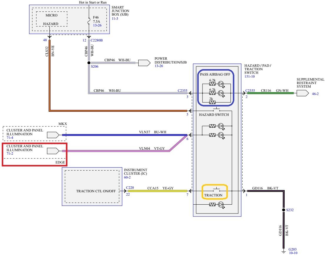 Haz Posted May 21, 2024 Report Share Posted May 21, 2024 (edited) I understand that you expect the Traction Control switch to light up briefly at Engine Start-up, in conjunction with the Instrument Cluster's bulb-check routine. I also understand that your Edge is not showing any Diagnostic Trouble Codes (DTCs) on your Code Scanner/Reader, nor any Check Engine Light (CEL), nor any other adverse messages or indicators, so you are concerned that a faulty fuse or circuit breaker may be responsible for the lack of any Traction Control status expressed by the Traction Control Switch lighting up or extinguishing in response to your button pushing, highlighted by the red oval in the following photo... Looking to the 2010 Edge wiring diagram, which I've highlighted with blue, red, and gold boxes... You may notice the depiction of the Passenger Airbag Off switch within the blue box includes an LED symbol directly in the circuit that the switch interrupts or completes. When the switch completes its circuit, the LED lights up and illuminates the words Passenger Airbag Off to express the status of the passenger airbag on the face of that switch button. You may also notice the depiction of the Traction Control switch within the gold box does not include an LED symbol directly in that circuit, meaning the button itself does not provide any system status feedback by lighting up. Other LEDs depicted in the wiring diagram provide the Traction Control/Hazard/Passenger Airbag Deactivation switch assembly with nighttime backlighting, delivered by the red-boxed Cluster and Panel Illumination circuits that backlight the various switches and other controls inside the cabin. So, the wiring diagram shows the Traction Control switch is not designed to light up or extinguish in response to button pushes, and its behavior that you are seeing is normal, not faulty. Looking next to the 2010 Edge Owner Guide, page 225, which I've highlighted with red and blue boxes... Regarding your expectation of something Traction Control-related lighting up at Engine Start-up, the red-boxed and blue-boxed portions of the above Owner Guide page shows that the Sliding Car icon, representing in part the Traction Control system, does light up briefly during the Engine Start-up in the Instrument Cluster and in response to Traction Control button pushes, as shown as red-surrounded Item 26 in the below illustration... So, recapping in response to your initial question... The Traction Control switch has no capacity to light up in response to button pushes, and, the status of the Traction Control system and other Anti-Lock Brake System (ABS) attributes is expressed by the Sliding Car icon in the Instrument Cluster. Traction Control switch is operating as designed, with it not providing any direct system status feedback, so you don't need to be concerned about that. The Owner Guide provides a fairly comprehensive description of ABS features and their behavior. Included below is a portion of the 2010 Edge Workshop Manual that provides a more technical explanation of your Edge's ABS. And finally, because I understand you wish to learn more about about your Edge, attached at the bottom, as a PDF document, is the 2010 Edge section of the SourceBook, an informational reference supplied to dealership sales personnel, which you may enjoy reading. Good luck! Placing your device cursor over underlined acronyms may yield full-words descriptions of those acronyms, below. Principles of Operation Standard ABS The standard ABS module manages anti-lock braking to maintain vehicle control during deceleration. When the ignition switch is in the RUN position, the ABS module does a preliminary electrical check and, at approximately 20 km/h (12 mph), the hydraulic pump motor is turned on for approximately one-half second. During this time, a buzzing or humming noise may be heard and a vibration maybe felt in the brake pedal. This is a normal condition. Any malfunction of the ABS disables the stability control and the ABS warning indicator illuminates. However, the power-assist braking system functions normally. The ABS module monitors and compares the rotational speed of each wheel. Wheel speeds are measured by the wheel speed sensor, which electrically senses each tooth of the sensor ring as it passes through the magnetic field of the sensor. When the ABS module detects an impending wheel lock, the ABS module commands the hydraulic pump motor on and commands the Hydraulic Control Unit (HCU) to open and close the appropriate solenoid valves to modulate the brake pressure to the individual brake caliper(s). Once the affected wheel(s) return to the desired speed, the ABS module commands the HCU to return the solenoid valves to their normal position and normal base brake operation is restored. In extreme cold conditions (temperature less than -25°C [-13°F]), the ABS module will briefly operate the hydraulic pump motor when the accelerator is pressed. This is done to warm the brake fluid. Electronic Brake Distribution (EBD) On initial application of the brake pedal, full pressure is applied to the rear brakes. The ABS module then uses wheel speed input to calculate an estimated rate of deceleration. Once vehicle deceleration exceeds a predetermined threshold, the ABS module closes the appropriate isolation valves in the HCU to hold the rear brake pressure constant while allowing the front brake pressure to build. This creates a balanced braking condition between the front and rear wheels and minimizes the chance of rear wheel lockup during hard braking. As the vehicle decelerates, the valves are opened to increase the rear brake pressure in proportion to the front brake pressure. A slight bump sensation may be felt in the brake pedal when Electronic Brake Distribution (EBD) is active. If ABS is disabled due to DTCs being present in the ABS module, EBD will continue to function unless the DTCs are for wheel speed sensors or the HCU . When EBD is disabled, the ABS w
