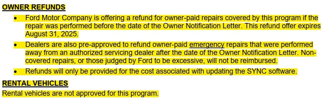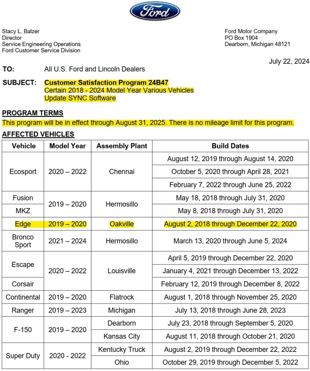 Haz Posted December 5, 2024 Author Report Share Posted December 5, 2024 Ford has issued Supplement #1 to the Dealer Bulletin for Customer Satisfaction Program 24B47, reinforcing utilization of Technical Support (TSR) process and the Dealer Software Support (DSSH) Hotline when difficulties occur while performing the APIM software update, and/or if an APIM replacement is required to fulfill this Program, and providing additional Labor authorization for these TSR and DSSH interactions... 3 Quote Link to comment Share on other sites More sharing options...
