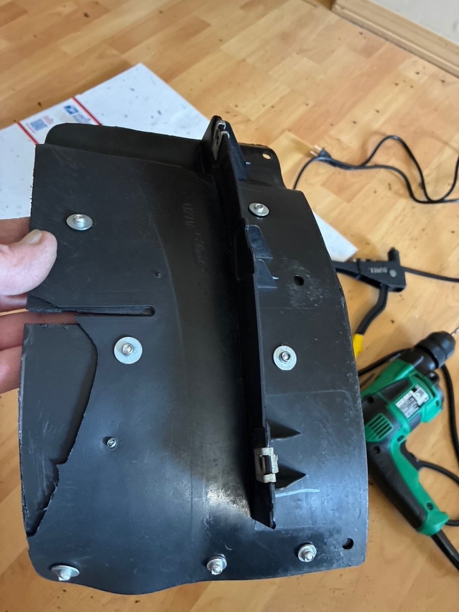 BMWR1200c Posted 2 hours ago Author Report Share Posted 2 hours ago (edited) Finally got to this project today. As previously stated, the splash shield is not sold separately. It is sold as part of the front fender liner. There are 3 plastic rivets attaching the shield to the liner, as well as two 9/32" bolts underneath. For easier access I also removed 2 plastic push pins and two 7/32" bolts attaching the liner to the fender. Used a pair of snips to break and remove the 3 plastic rivets inside the liner. Went to Lowe's and bought a black plastic bathroom garbage pail for around $8 that appeared to be the same thickness and material as the splash shield and was almost the same curvature/radius. Cut the pail in half the long way, flattened it out and traced the outline of the OEM splash shield on the garbage pail and used a dremel to cut it out. Smoothed all the edges and used about 10 aluminum pop rivets with small washers on the back side to attach the new plastic to the OEM shield. Used a heat gun to sort of melt part of the plastic to conform to a couple of curves in the OEM shield. Bought a Pittsburgh 7" Poly hand riveter kit for $12 at Harbor Freight, which came with an assortment of plastic rivets. Used that to re-attach the assembly to the fender liner. All in all about an hour's work, spent around $20 and its better than new, twice as thick as the original and looks fine. I even spray painted the aluminum rivets black, just because. And no need to remove the wheel/tire. With the steering wheel tuned full left there was plenty of easy access. Done and done! Edited 2 hours ago by BMWR1200c 1 Quote Link to comment Share on other sites More sharing options...